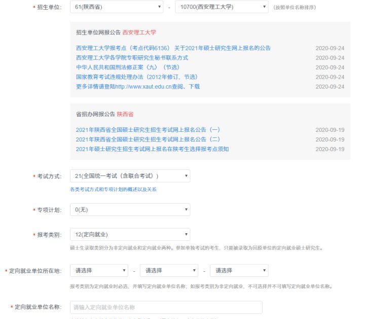 1、填寫報考單位(以西安理工大學非全日制為例,報考類別處報考非全日制研究生選“定向就業”。)