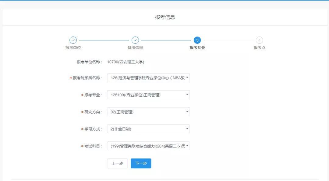 3、填寫報考專業“工商管理碩士”,選擇“非全日制”。
